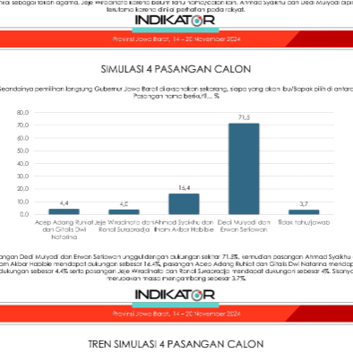 Hasilnya, KDM-Erwan Setiawan merajai dengan 71,5 persen, kemudian Ahmad Syaikhu-Ilham Ahmad Habibie 16,4 persen, Acep Adang Ruhiat-Gitalis Dwi Natarina 4,4 persen, Jeje Wiradinata-Ronal Surapradja 4,0 persen dan tidak tahu/tidak jawab 3,7 persen.